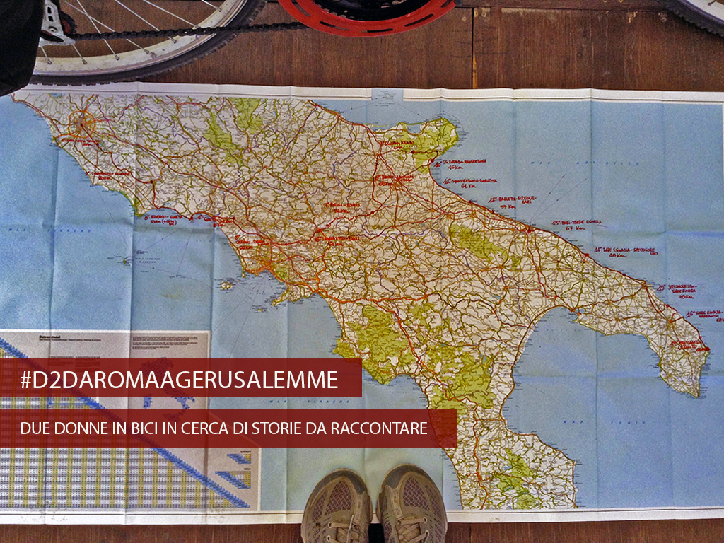 Riccardo ha una macelleria sulla statale, all’ombra delle montagne, sotto il valico. Ci fermiamo a bere, si affaccia: “Ma voi andate in Terra Santa? Vi ho visto alla televisione!” È un ragazzone imponente, ha occhi scuri e ciglia lunghe, e un sorriso tenero. Ci vuole offrire qualcosa. Entra e riesce con una confezione di merendine al cioccolato ed un paccone di biscotti. Accettiamo un paio di biscotti. “Hai figli? I bimbi sono ghiotti di merendine al cioccolato!”. “No”. Ci risponde. “Qua non è come al nord. Qua se vai al bar tra noi ci si offre il caffè, e ogni volta è un caffè, e alla fine sono 10€ al giorno. Io invece ho un fornelletto e il caffè me lo faccio da solo. Ho i cornetti, e pure le sigarette me le costruisco io. Così 10€ li spendo in un mese!”. Riccardo è una gran persona. Riccardo ha le maniche arrotolate, come chi lavora. Ci regala una bottiglia di acqua ghiacciata. Lo salutiamo. Procediamo per la salita, su attraverso le Forche Caudine, e poi fino in cima, ad Arpaia, dove finalmente ci fermiamo per un’abbondante colazione -abbondante è solo un tiepido eufemismo che non rende minimamente giustizia al gigantismo degli oggetti che ci vengono messi sul tavolo-: cornetti smisurati, bicchieri di latte che sembrano brocche ed una tortina alla crema di ricotta che peserà un chilo. Ma, tanto, “Dopo è tutta discesa”… 6agosto2013 – dal diario di viaggio “D2_daromaagerusalemme”